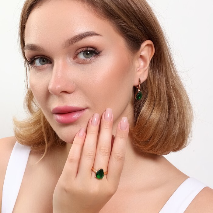 Комплект ювелирная бижутерия коллекция  "Дубай" серьги и кольцо 20 р, покрытие: позолота, вставка: фианит, цвет: изумрудный, арт.313.088-20 2 фото