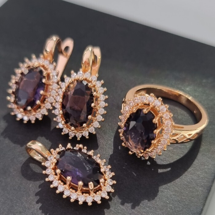 Комплект ювелирная бижутерия коллекция  "Дубай" серьги, кулон и кольцо 17 р, покрытие: позолота, вставка: фианит, цвет: фиолетовый и прозрачный, арт.313.094-17 2 фото