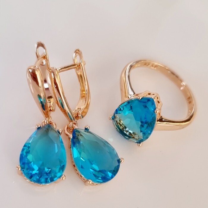 Комплект ювелирная бижутерия коллекция  "Дубай" серьги и кольцо 18 р, покрытие: позолота, вставка: фианит, цвет: голубой, арт.313.092-18 2 фото