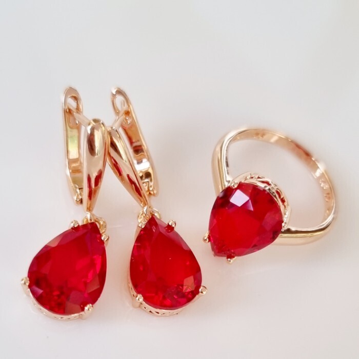 Комплект ювелирная бижутерия коллекция  "Дубай" серьги и кольцо 18 р, покрытие: позолота, вставка: фианит, цвет: красный, арт.313.089-18 2 фото