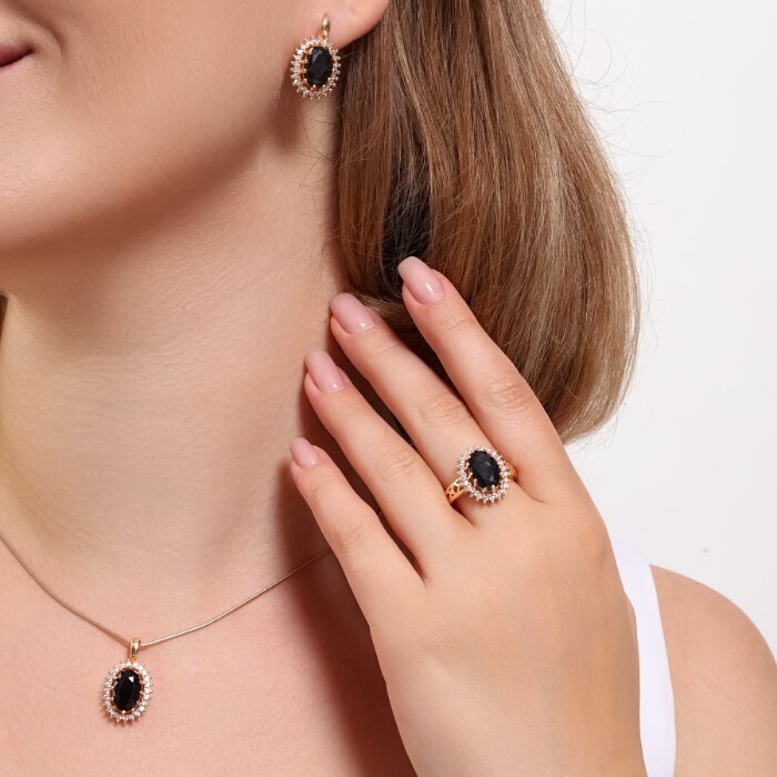 Комплект ювелирная бижутерия коллекция  "Дубай" серьги, кулон и кольцо 19 р, покрытие: позолота, вставка: фианит, цвет: черный и прозрачный, арт.313.098-19 2 фото