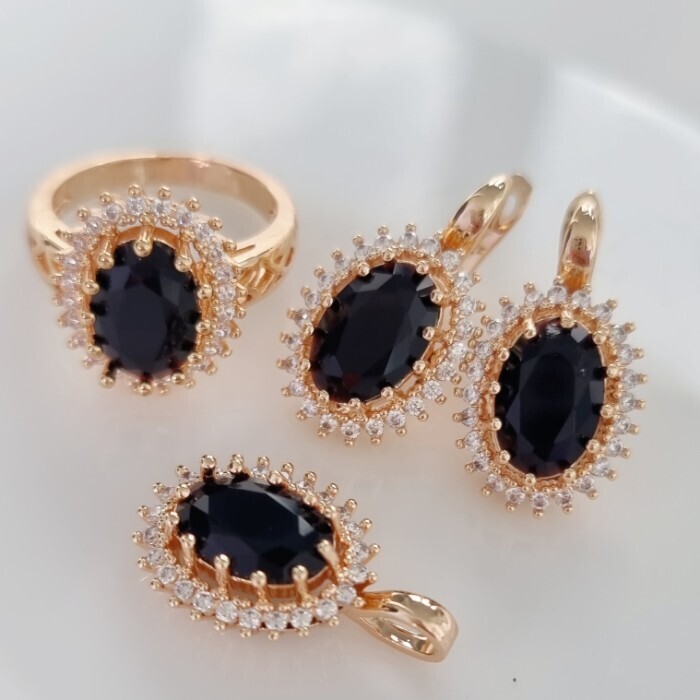 Комплект ювелирная бижутерия коллекция  "Дубай" серьги, кулон и кольцо 18 р, покрытие: позолота, вставка: фианит, цвет: черный и прозрачный, арт.313.098-18 2 фото