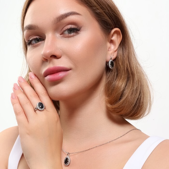 Комплект ювелирная бижутерия серьги, кулон и кольцо 17 р, покрытие: посеребрение, вставка: фианит, цвет: черный и прозрачный, арт.313.100-17 2 фото