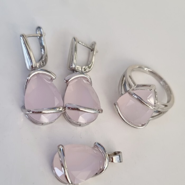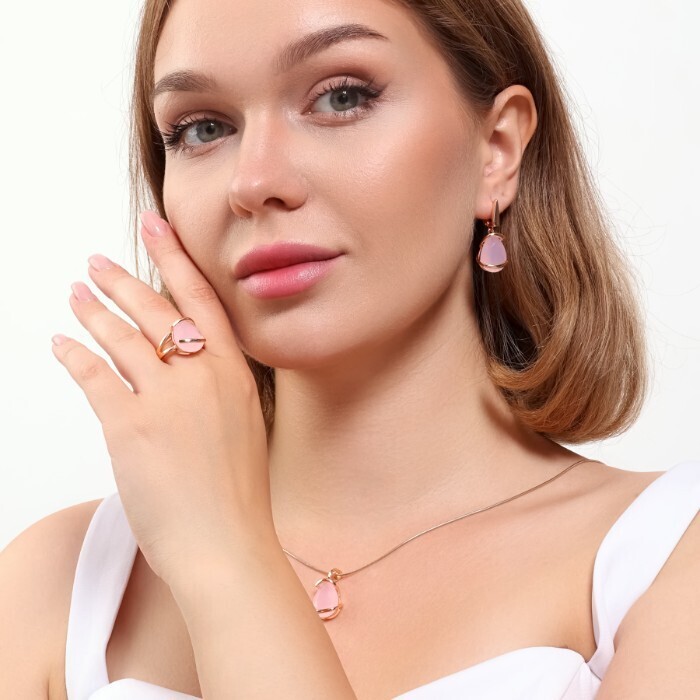 Комплект ювелирная бижутерия серьги, кулон и кольцо 17 р, покрытие: посеребрение, вставка: фианит, цвет: розовый матовый, арт.313.066-17 2 фото