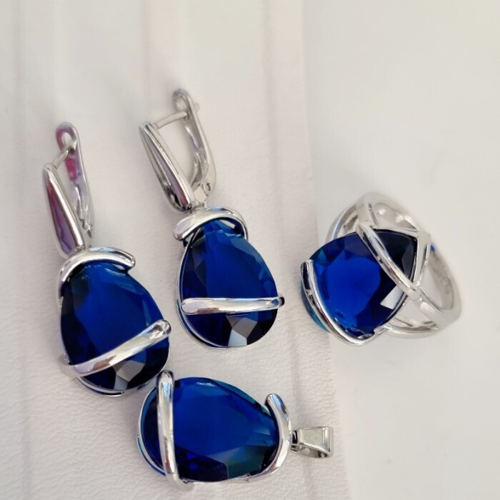 Комплект ювелирная бижутерия серьги, кулон и кольцо 18 р, покрытие: посеребрение, вставка: фианит, цвет: синий, арт.313.068-18 2 фото