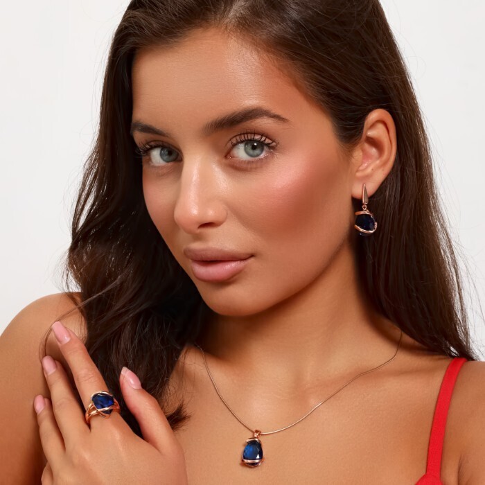 Комплект ювелирная бижутерия коллекция  "Дубай" серьги, кулон и кольцо 20 р, покрытие: позолота, вставка: фианит, цвет: синий, арт.313.058-20 2 фото