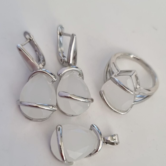 Комплект ювелирная бижутерия серьги, кулон и кольцо 18 р, покрытие: посеребрение, вставка: фианит, цвет: молочный матовый, арт.313.065-18 2 фото