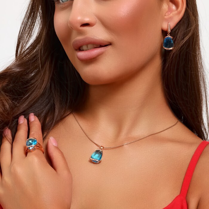 Комплект ювелирная бижутерия коллекция  "Дубай" серьги, кулон и кольцо 18 р, покрытие: позолота, вставка: фианит, цвет: голубой, арт.313.062-18 2 фото