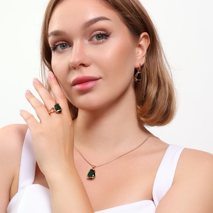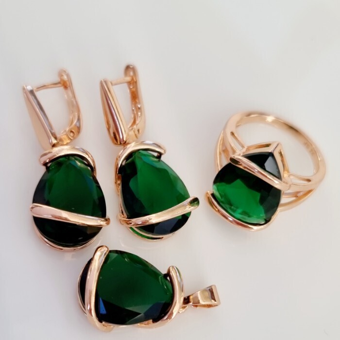 Комплект ювелирная бижутерия коллекция  "Дубай" серьги, кулон и кольцо 18 р, покрытие: позолота, вставка: фианит, цвет: зеленый, арт.313.057-18 2 фото