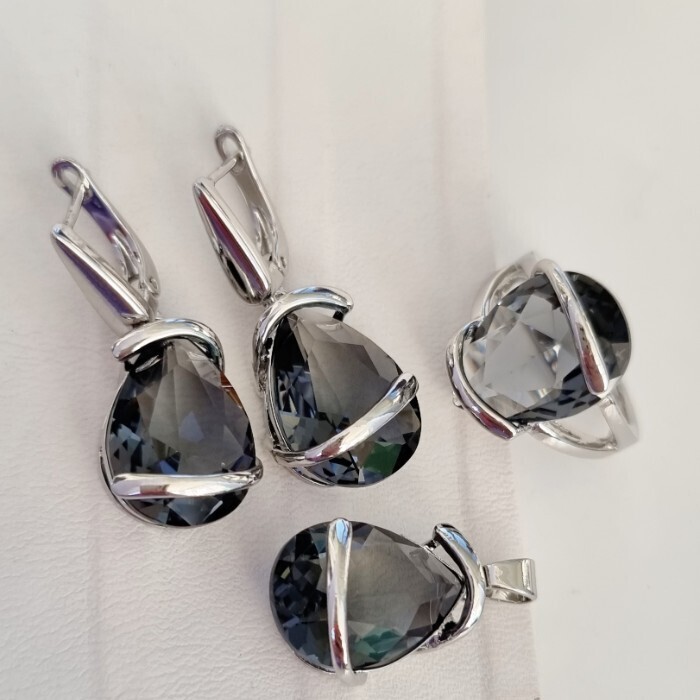 Комплект ювелирная бижутерия серьги, кулон и кольцо 18 р, покрытие: посеребрение, вставка: фианит, цвет: серый, арт.313.064-18 2 фото