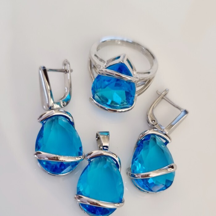 Комплект ювелирная бижутерия серьги, кулон и кольцо 18 р, покрытие: посеребрение, вставка: фианит, цвет: голубой, арт.313.067-18 2 фото