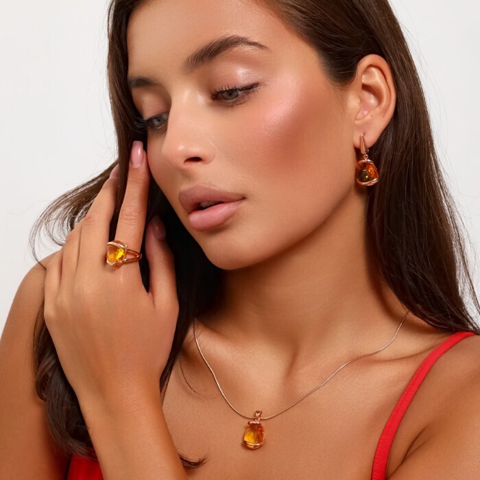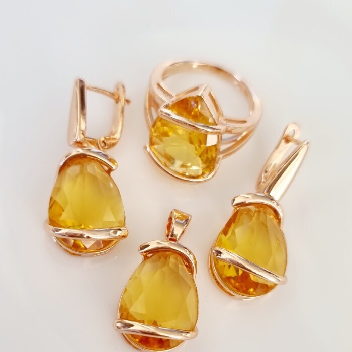 Комплект ювелирная бижутерия серьги, кулон и кольцо 17 р, покрытие: посеребрение, вставка: фианит, цвет: желтый, арт.313.069-17 2 фото