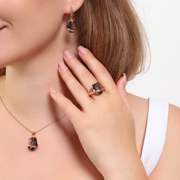Комплект ювелирная бижутерия коллекция  "Дубай" серьги, кулон и кольцо 20 р, покрытие: позолота, вставка: фианит, цвет: серый, арт.313.063-20 2 фото