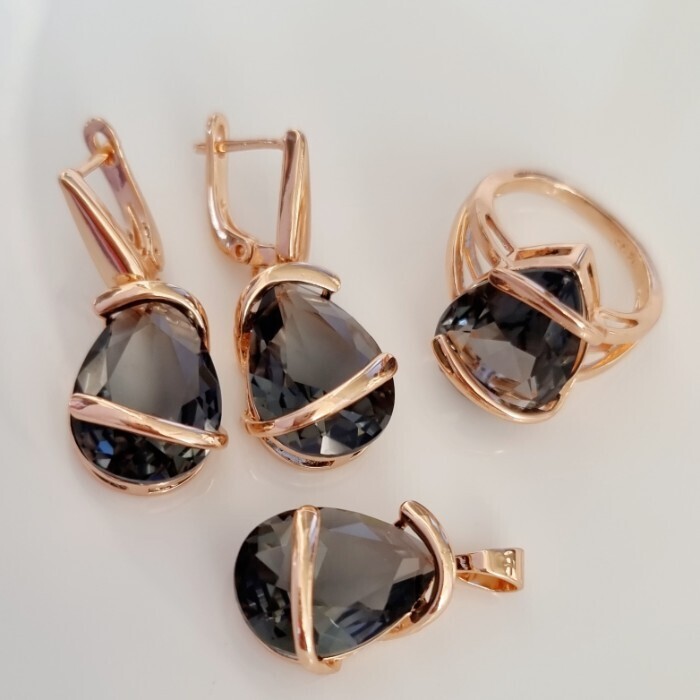 Комплект ювелирная бижутерия коллекция  "Дубай" серьги, кулон и кольцо 18 р, покрытие: позолота, вставка: фианит, цвет: серый, арт.313.063-18 2 фото