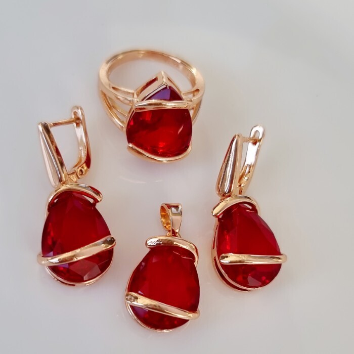 Комплект ювелирная бижутерия коллекция  "Дубай" серьги, кулон и кольцо 18 р, покрытие: позолота, вставка: фианит, цвет: красный, арт.313.060-18 2 фото