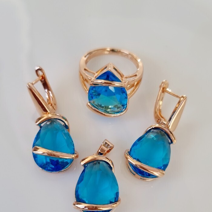 Комплект ювелирная бижутерия коллекция  "Дубай" серьги, кулон и кольцо 17 р, покрытие: позолота, вставка: фианит, цвет: голубой, арт.313.062-17 2 фото