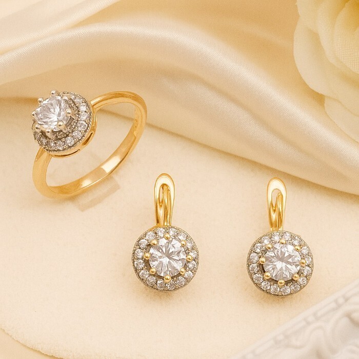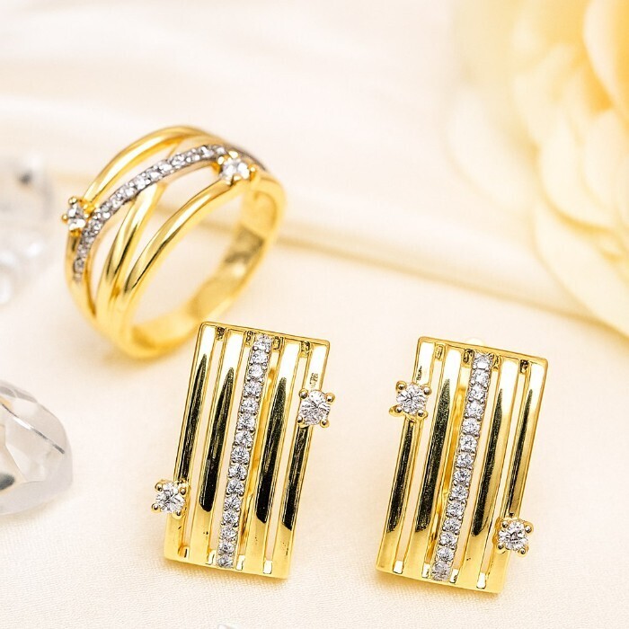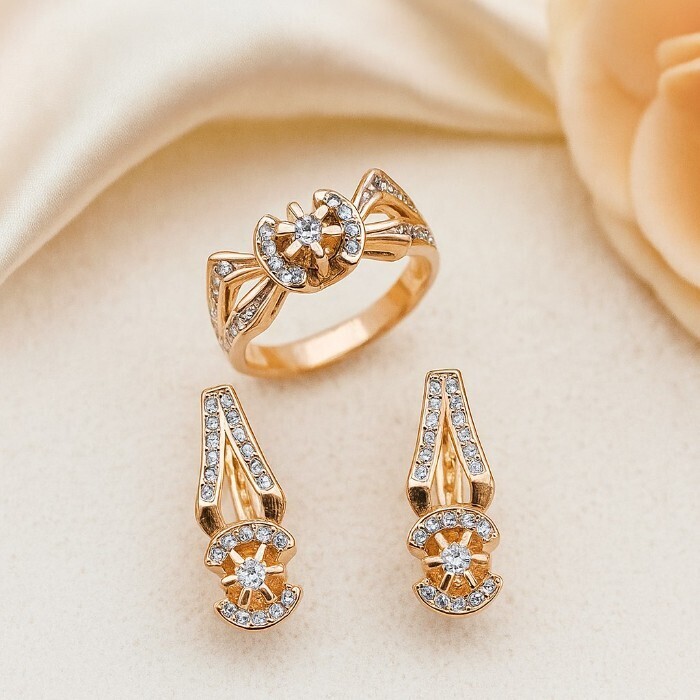 Комплект ювелирной бижутерии Итальянское золото (покрытие желтое 14к), серьги и кольцо 17 р, вставка: фианиты, цвет: прозрачный, арт.216.403-17