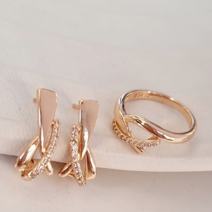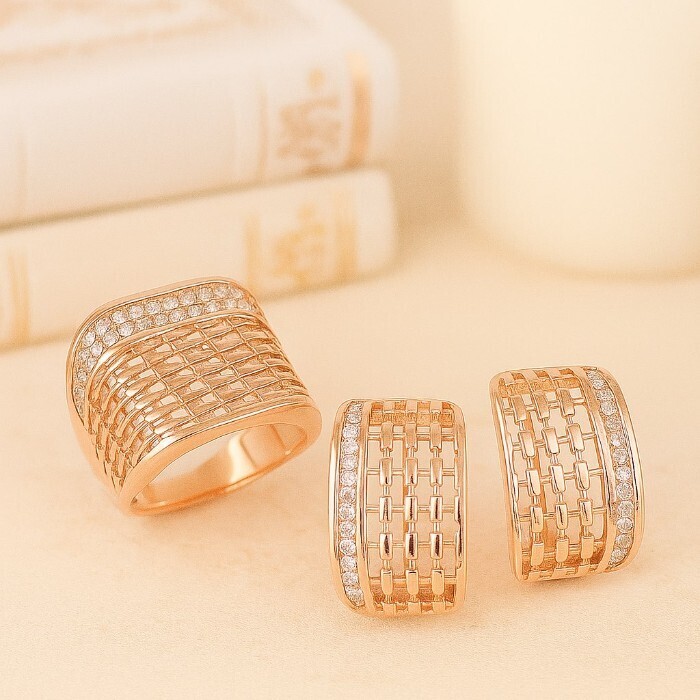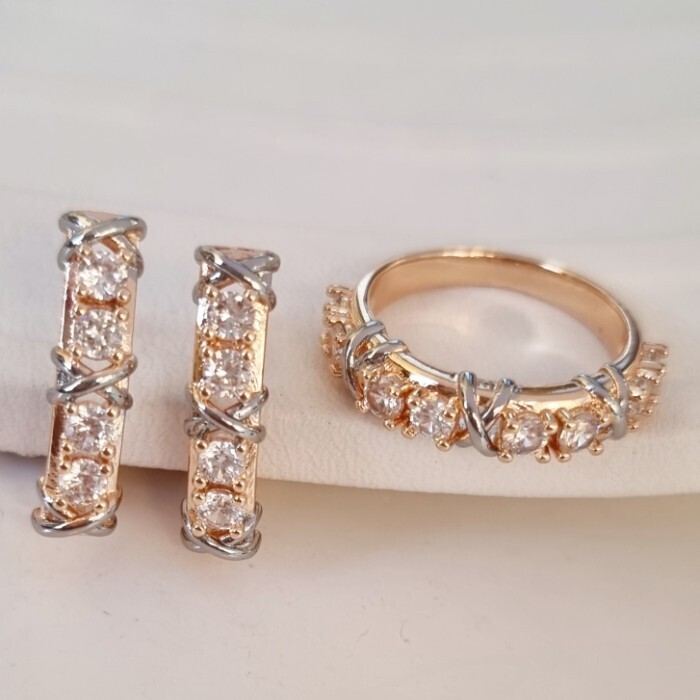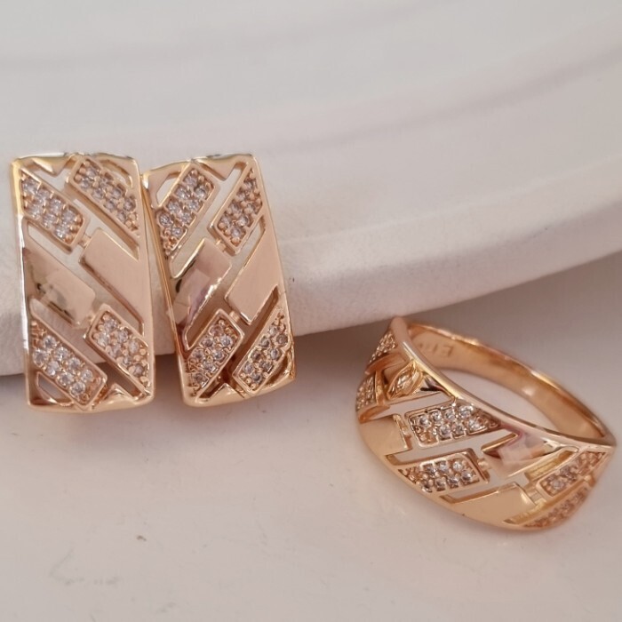 Комплект ювелирной бижутерии Итальянское золото (покрытие желтое 14к), серьги и кольцо 17 р, вставка: фианиты, цвет: прозрачный, арт.216.406-17