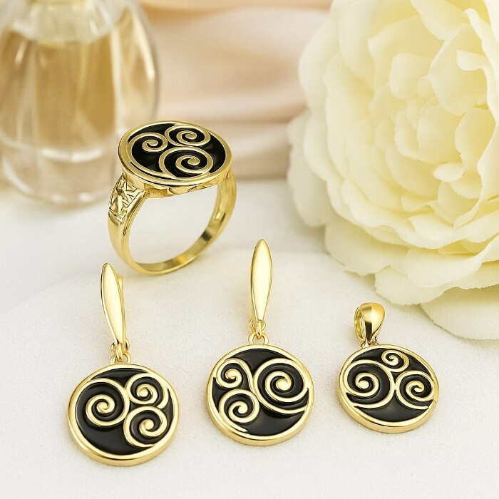 Комплект ювелирной бижутерии Итальянское золото (покрытие желтое 14к), серьги, кулон и кольцо 20 р, вставка: черная эмаль, арт.216.404-20