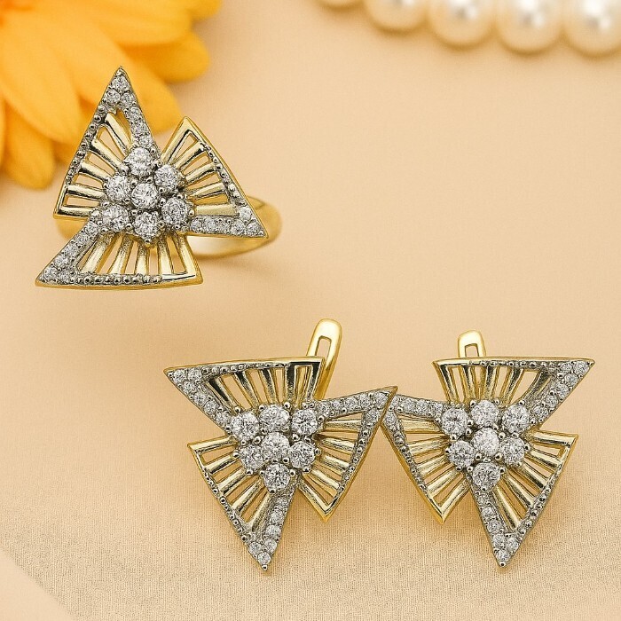 Комплект ювелирной бижутерии Итальянское золото (покрытие желтое 14к), серьги и кольцо 19 р, вставка: фианиты, цвет: прозрачный, арт.216.398-19