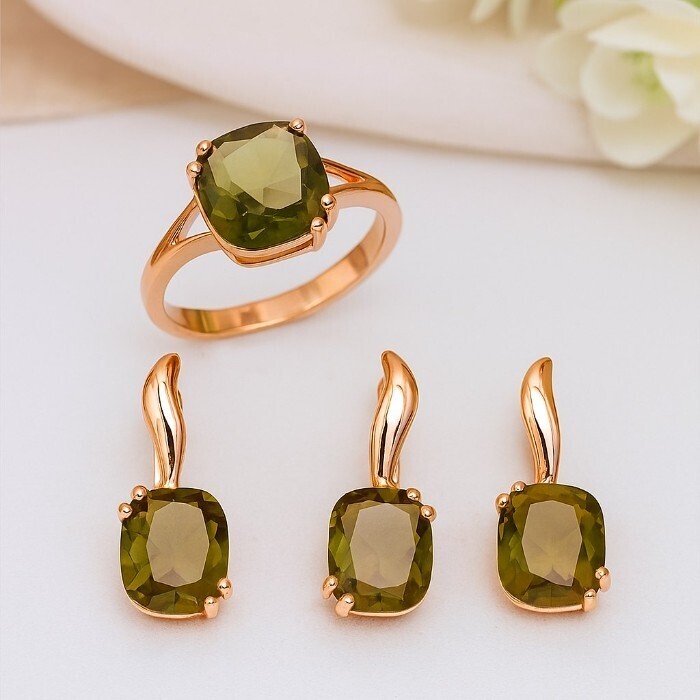 Комплект ювелирной бижутерии коллекция "Дубай" серьги, кулон и кольцо 18 р, покрытие позолота, вставка: фианиты, цвет: оливковый, арт.216.400-18