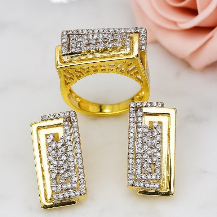 Комплект ювелирной бижутерии Итальянское золото (покрытие желтое 14к), серьги и кольцо 19 р, вставка: фианиты, цвет: прозрачный, арт.216.406-19