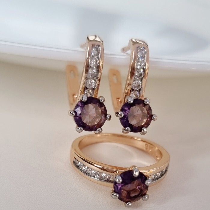 Комплект ювелирной бижутерии коллекция "Дубай" серьги и кольцо 17 р, покрытие позолота, вставка: фианиты, цвет: фиолетовый и прозрачный, арт.215.371-17 2 фото