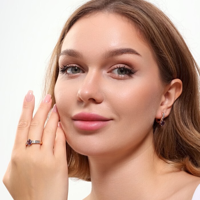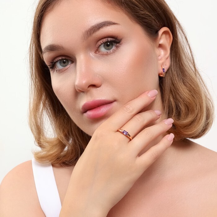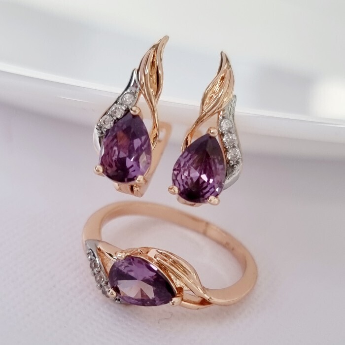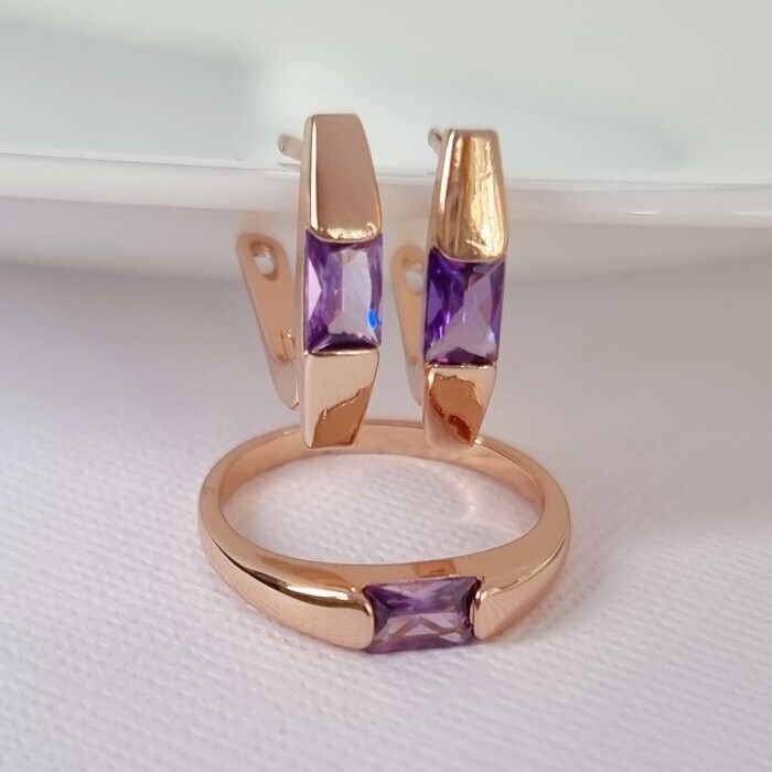 Комплект ювелирной бижутерии коллекция "Дубай" серьги и кольцо 17 р, покрытие позолота, вставка: фианиты, цвет: фиолетовый, арт.215.381-17 2 фото