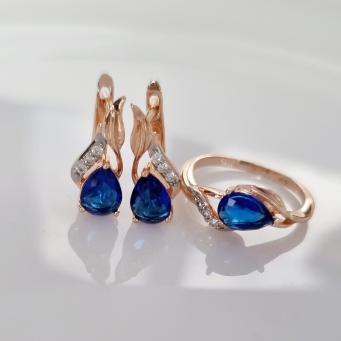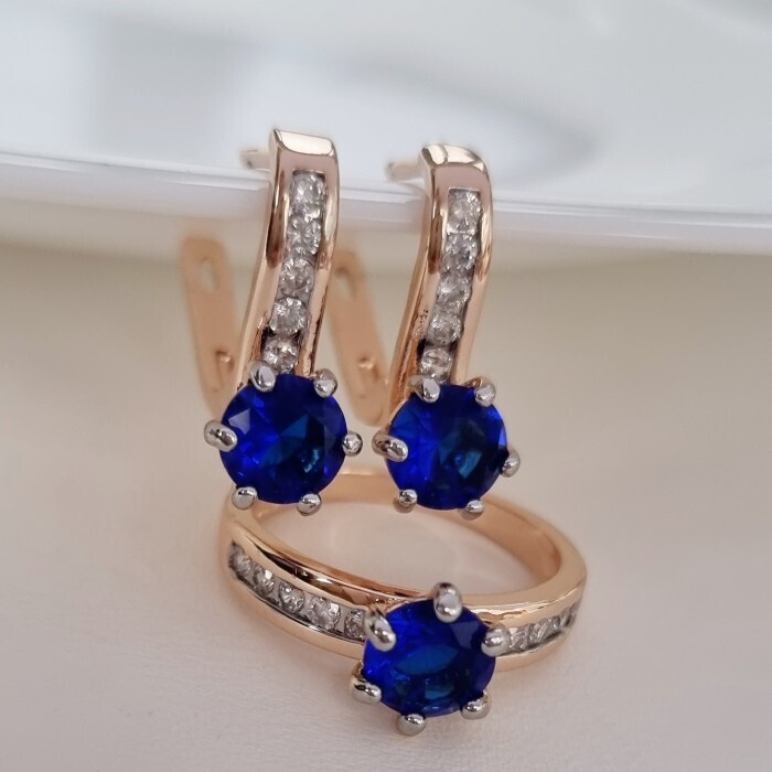 Комплект ювелирной бижутерии коллекция "Дубай" серьги и кольцо 20 р, покрытие позолота, вставка: фианиты, цвет: сапфировый и прозрачный, арт.215.373-20 2 фото