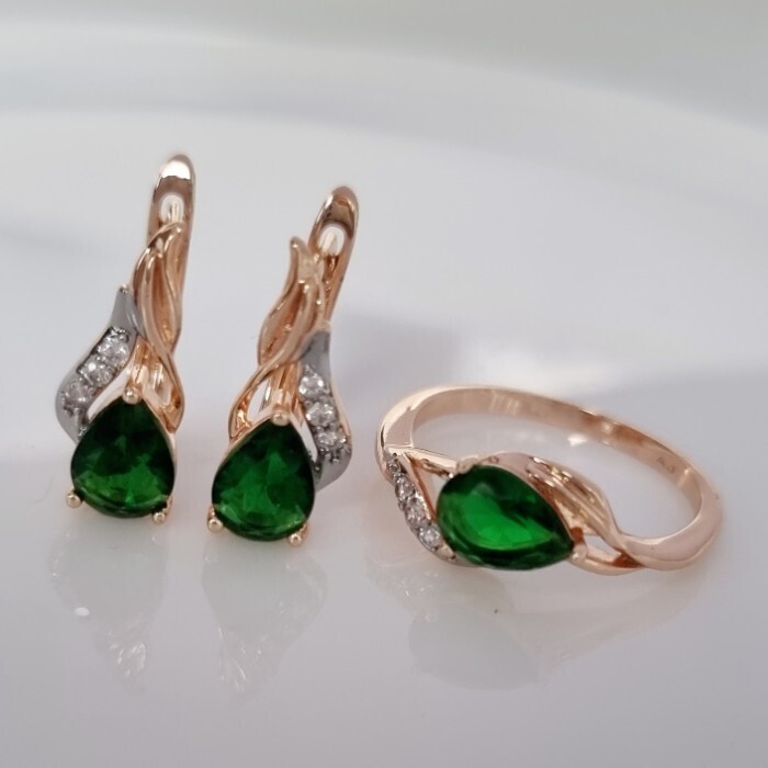 Комплект ювелирной бижутерии коллекция "Дубай" серьги и кольцо 18 р, покрытие позолота, вставка: фианиты, цвет: зеленый и прозрачный, арт.215.380-18 2 фото