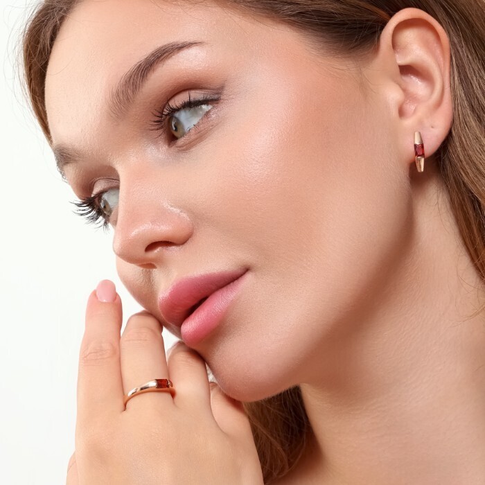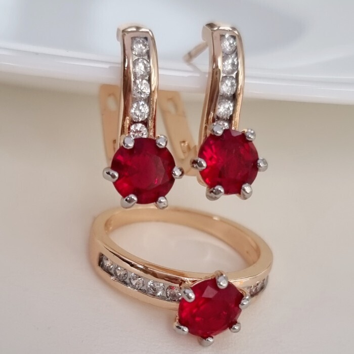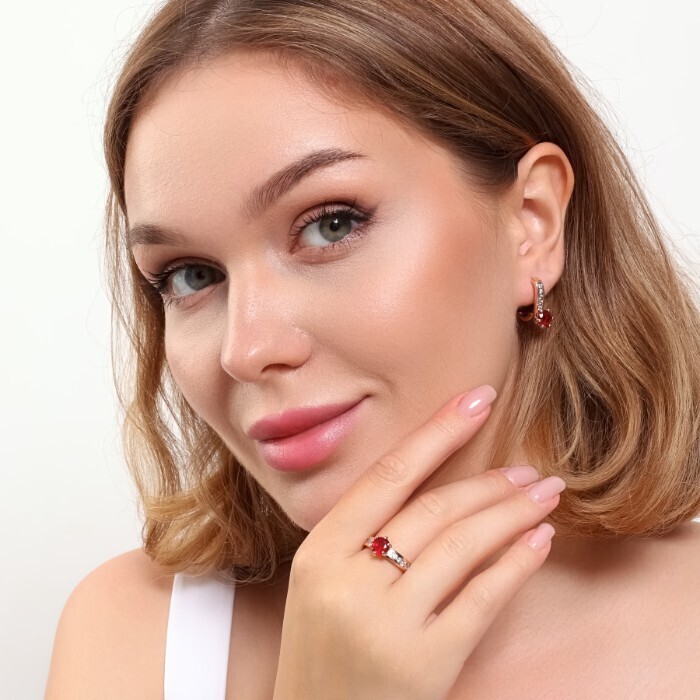 Комплект ювелирной бижутерии коллекция "Дубай" серьги и кольцо 19 р, покрытие позолота, вставка: фианиты, цвет: красный и прозрачный, арт.215.375-19 2 фото