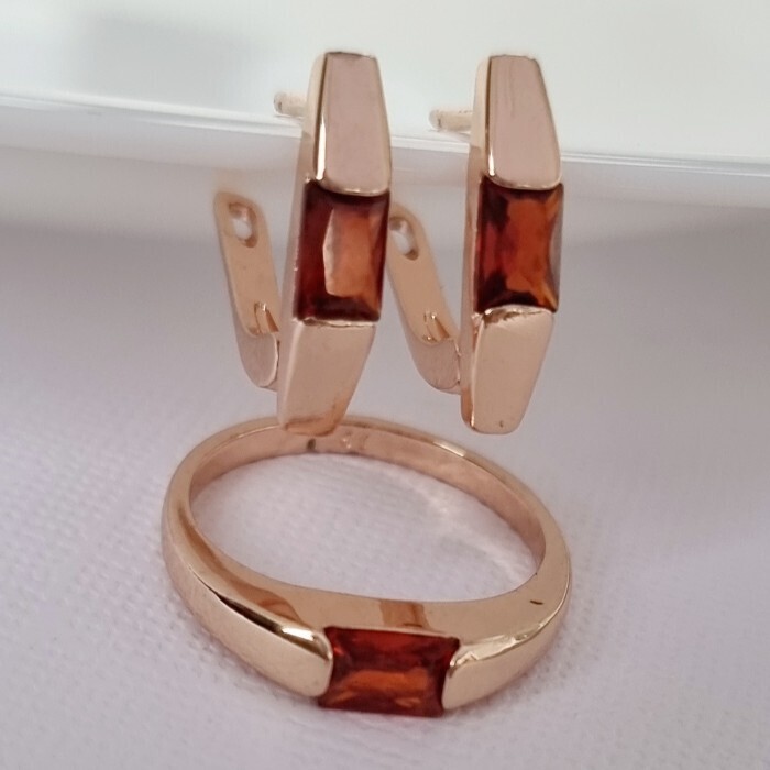 Комплект ювелирной бижутерии коллекция "Дубай" серьги и кольцо 17 р, покрытие позолота, вставка: фианиты, цвет: оранжево-красный, арт.215.382-17 2 фото