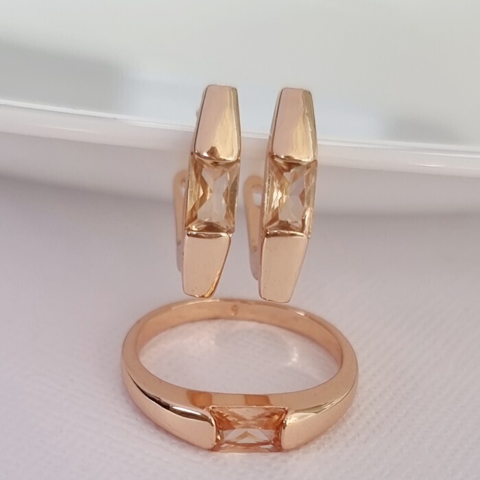 Комплект ювелирной бижутерии коллекция "Дубай" серьги и кольцо 18 р, покрытие позолота, вставка: фианиты, цвет: шампань, арт.215.384-18 2 фото