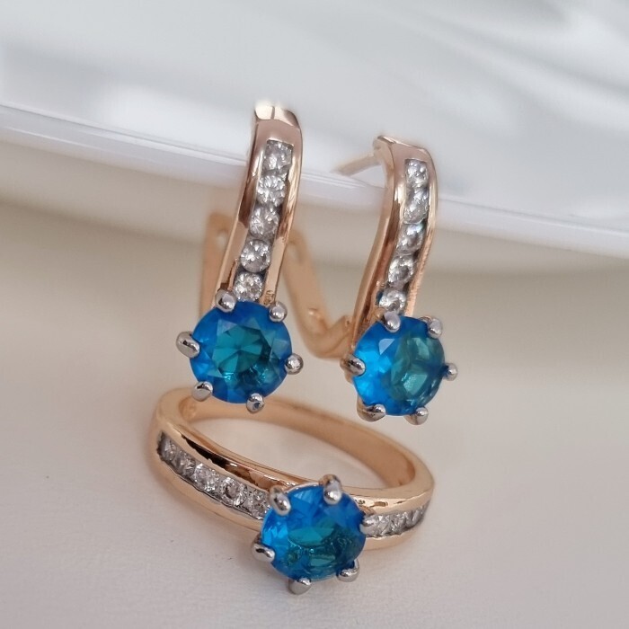 Комплект ювелирной бижутерии коллекция "Дубай" серьги и кольцо 18 р, покрытие позолота, вставка: фианиты, цвет: голубой и прозрачный, арт.215.374-18 2 фото