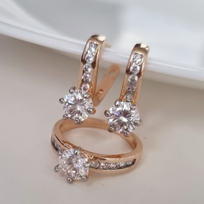 Комплект ювелирной бижутерии коллекция "Дубай" серьги и кольцо 18 р, покрытие позолота, вставка: фианиты, цвет: прозрачный, арт.215.378-18 2 фото
