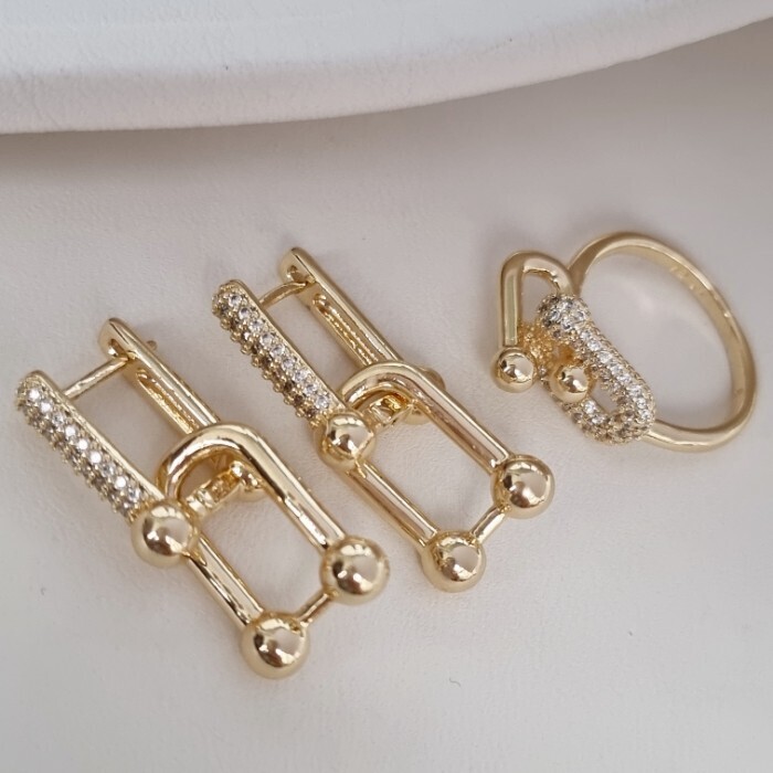 Комплект ювелирной бижутерии Итальянское золото (покрытие желтое 14к), серьги и кольцо 19 р, вставка: фианиты, цвет: прозрачный, арт.213.948-19 2 фото