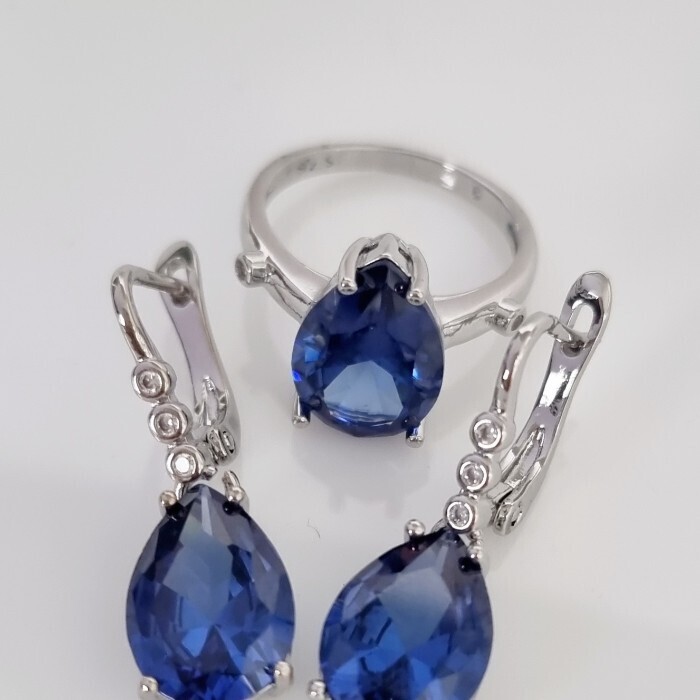 Комплект ювелирной бижутерии серьги и кольцо 18 р, покрытие посеребрение, вставка: фианиты, цвет: синий и прозрачный, арт.213.942-18 2 фото