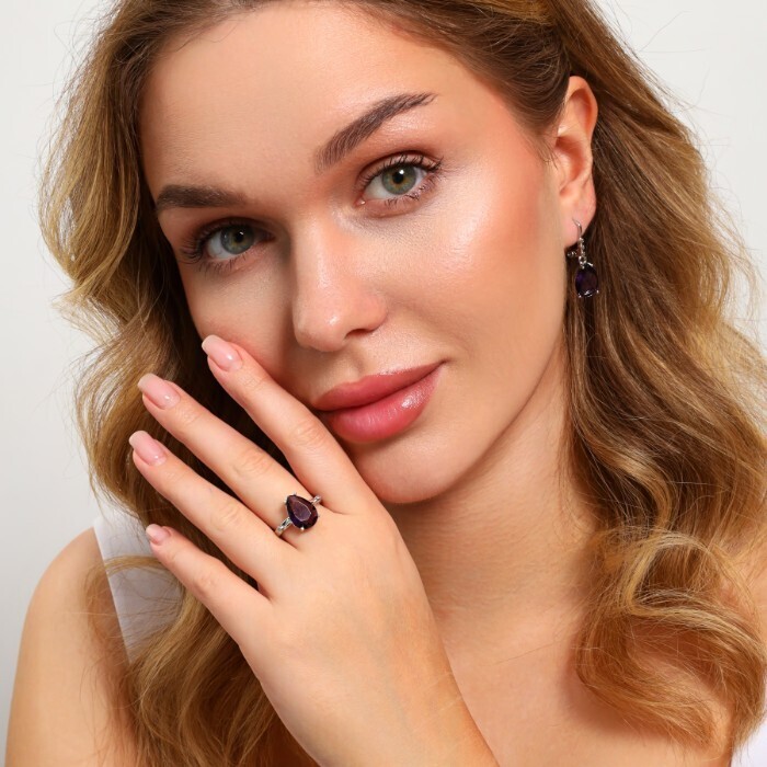Комплект ювелирной бижутерии серьги и кольцо 18 р, покрытие посеребрение, вставка: фианиты, цвет: фиолетовый и прозрачный, арт.213.944-18 2 фото
