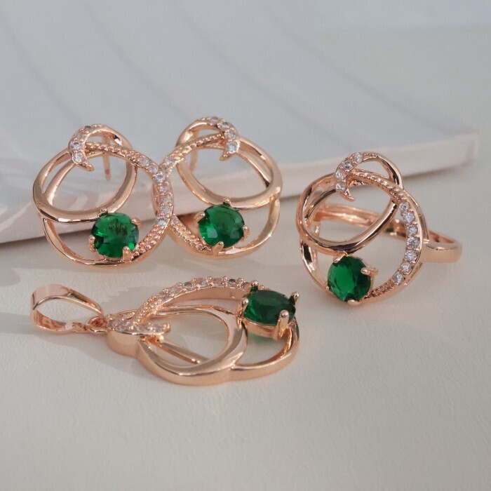Комплект ювелирная бижутерия коллекция "Дубай" серьги, кулон и кольцо 18 р, покрытие: позолота, вставка: фианиты, цвет: прозрачный и зеленый, арт.213.793-18 2 фото
