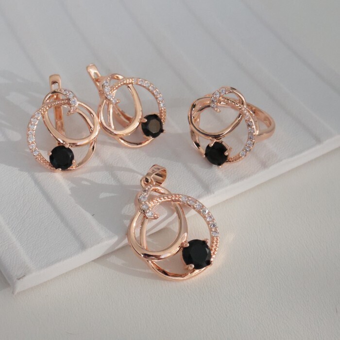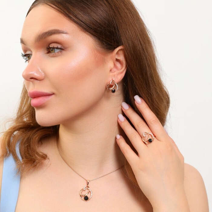 Комплект ювелирная бижутерия коллекция "Дубай" серьги, кулон и кольцо 18 р, покрытие: позолота, вставка: фианиты, цвет: прозрачный и черный, арт.213.792-18 2 фото