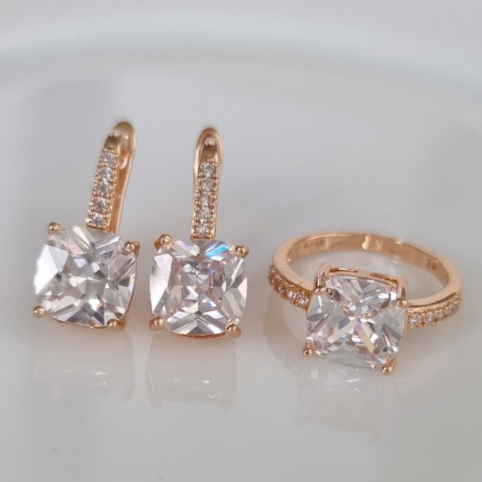 Комплект ювелирная бижутерия с квадратным камнем коллекция  "Дубай" серьги и кольцо 17 р, покрытие: позолота, вставка: фианиты, цвет: прозрачный, арт.213.785-17 2 фото