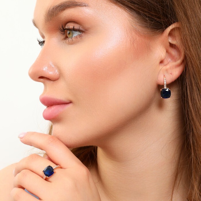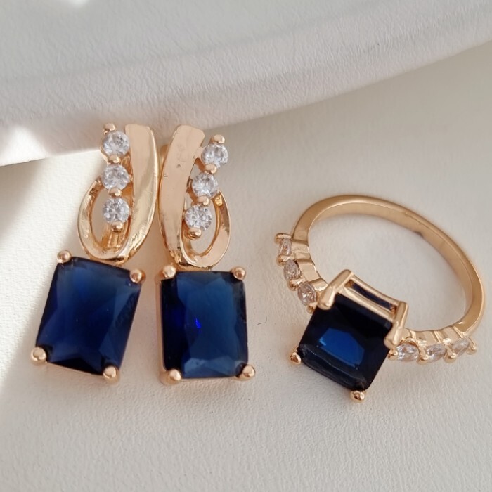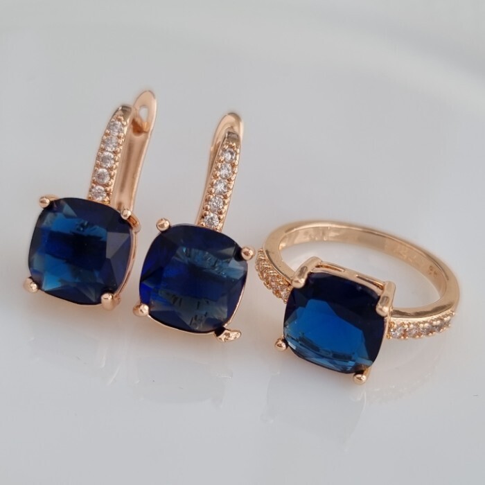 Комплект ювелирная бижутерия с квадратным камнем коллекция  "Дубай" серьги и кольцо 20 р, покрытие: позолота, вставка: фианиты, цвет: прозрачный и синий, арт.213.787-20 2 фото