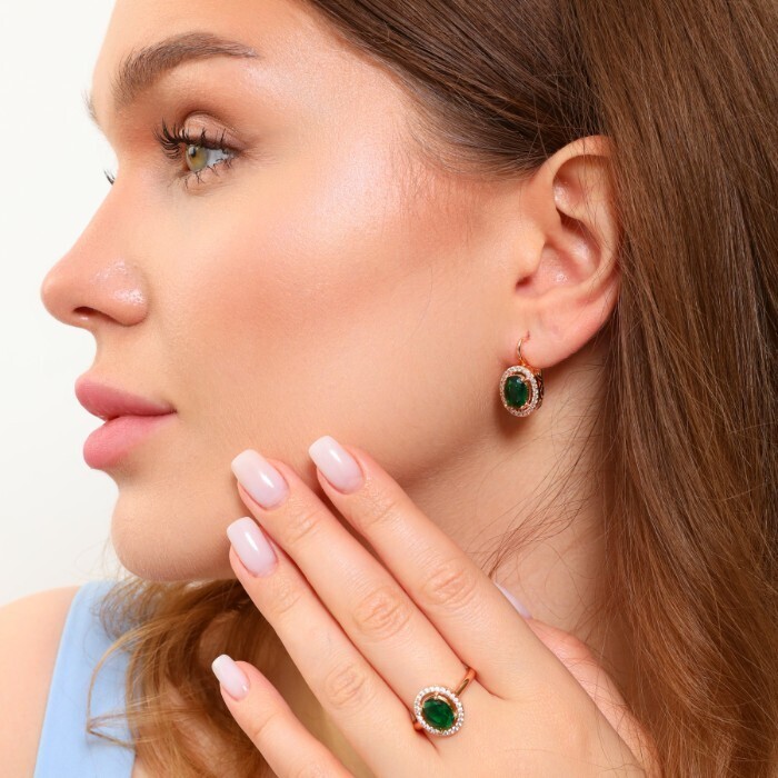 Комплект ювелирная бижутерия коллекция  "Дубай" серьги и кольцо 17 р, покрытие: позолота, вставка: фианиты, цвет: прозрачный и зеленый, арт.213.783-17 2 фото