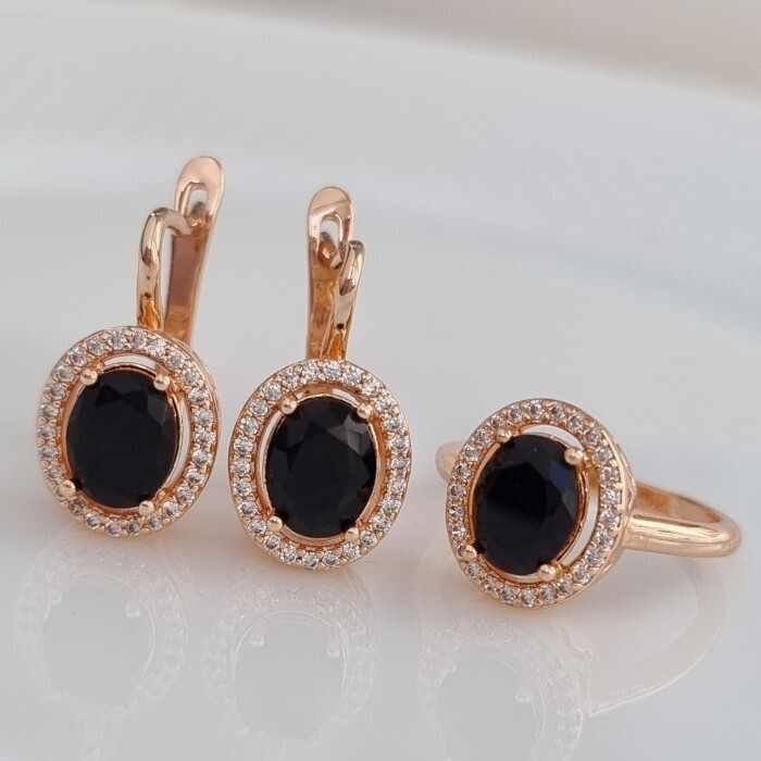 Комплект ювелирная бижутерия коллекция  "Дубай" серьги и кольцо 18 р, покрытие: позолота, вставка: фианиты, цвет: прозрачный и черный, арт.213.790-18 2 фото