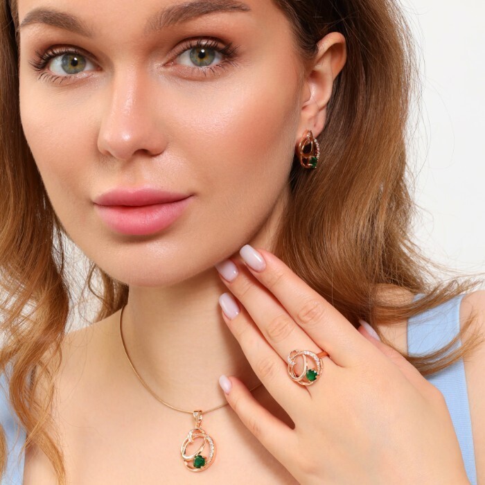 Комплект ювелирная бижутерия коллекция "Дубай" серьги, кулон и кольцо 19 р, покрытие: позолота, вставка: фианиты, цвет: прозрачный и зеленый, арт.213.793-19 2 фото