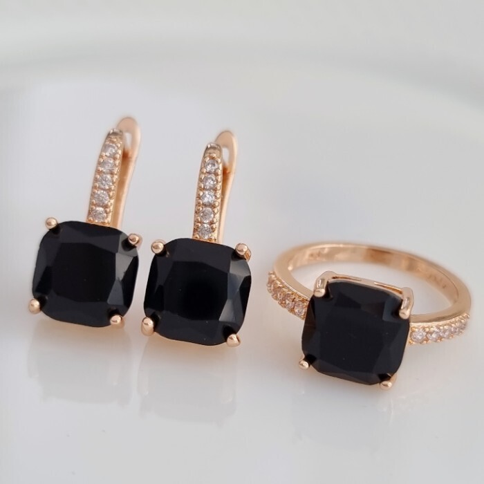 Комплект ювелирная бижутерия с квадратным камнем коллекция  "Дубай" серьги и кольцо 17 р, покрытие: позолота, вставка: фианиты, цвет: прозрачный и черный, арт.213.789-17 2 фото