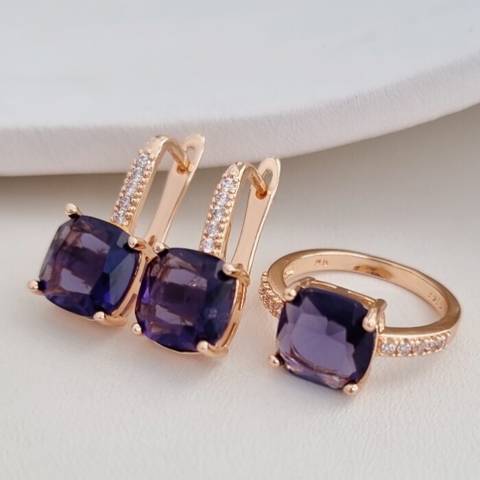 Комплект ювелирная бижутерия с квадратным камнем коллекция  "Дубай" серьги и кольцо 17 р, покрытие: позолота, вставка: фианиты, цвет: прозрачный и фиолетовый, арт.213.786-17 2 фото