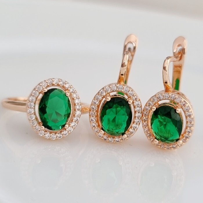 Комплект ювелирная бижутерия коллекция  "Дубай" серьги и кольцо 18 р, покрытие: позолота, вставка: фианиты, цвет: прозрачный и зеленый, арт.213.783-18 2 фото