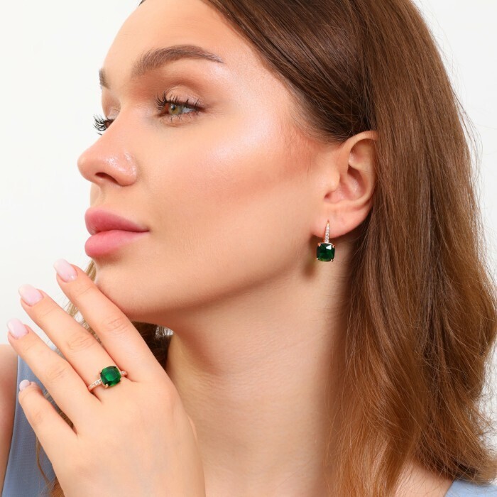 Комплект ювелирная бижутерия с квадратным камнем коллекция  "Дубай" серьги и кольцо 17 р, покрытие: позолота, вставка: фианиты, цвет: прозрачный и зеленый, арт.213.788-17 2 фото