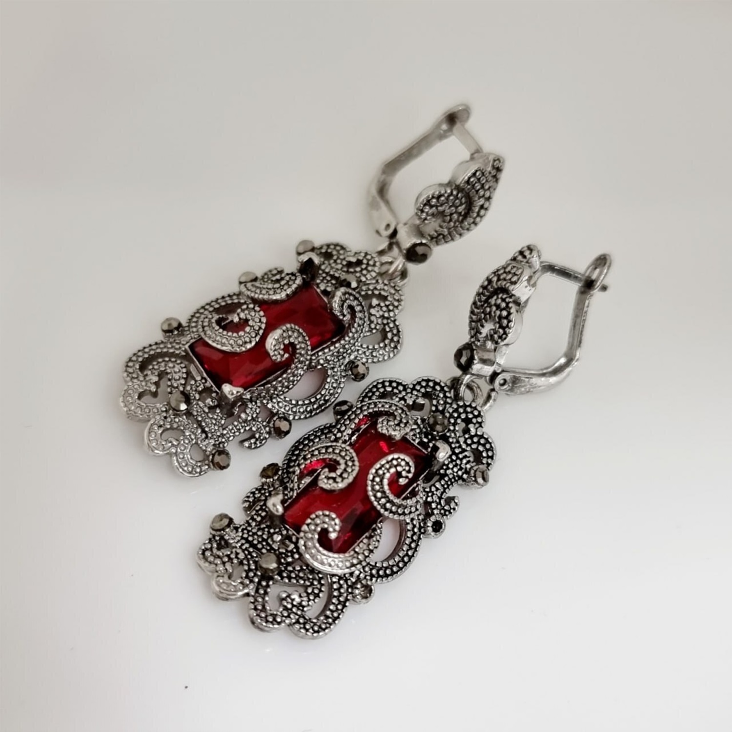 Серьги подвески ювелирная бижутерия, покрытие посеребрение, вставка: фианиты, цвет графит и красный, Уценка,  арт.213.740